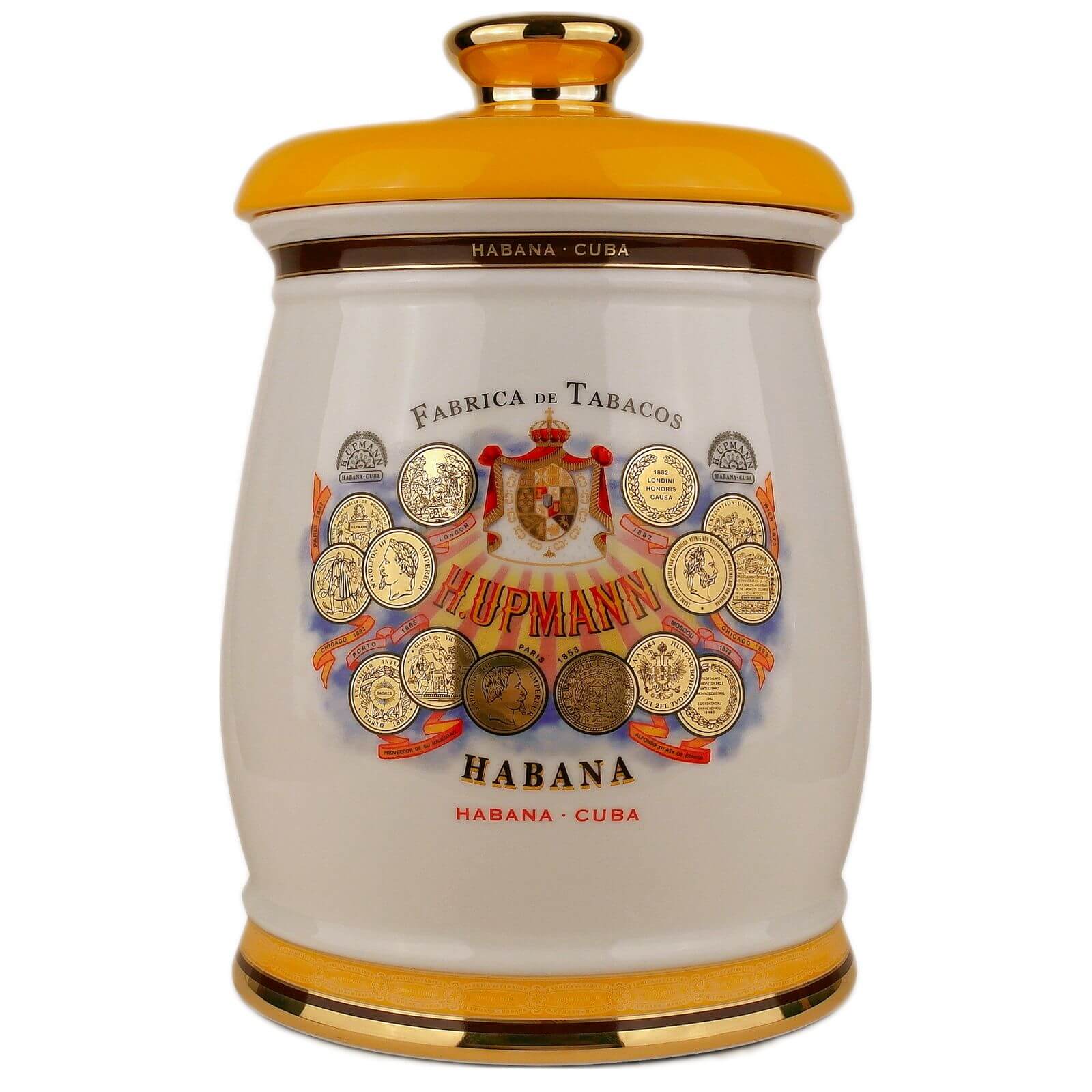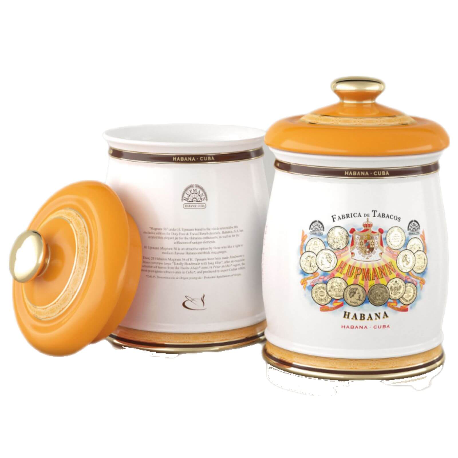Los tarros de porcelana de Cuba representan una forma tradicional de almacenar Habanos con estilo que ha sido popular desde finales del siglo XVIII. Estas cajas de puros, también conocidas como "tinajas", ofrecen espacio para hasta 25 puros de gran formato, que se mantienen erguidos en su interior. La tapa tiene un elemento de humidificación pasiva que regula la humedad, mientras que una base de corcho en el fondo mantiene los puros firmemente en su sitio. Los tarros se suministran en cajas de marca que reflejan el diseño de la marca correspondiente.