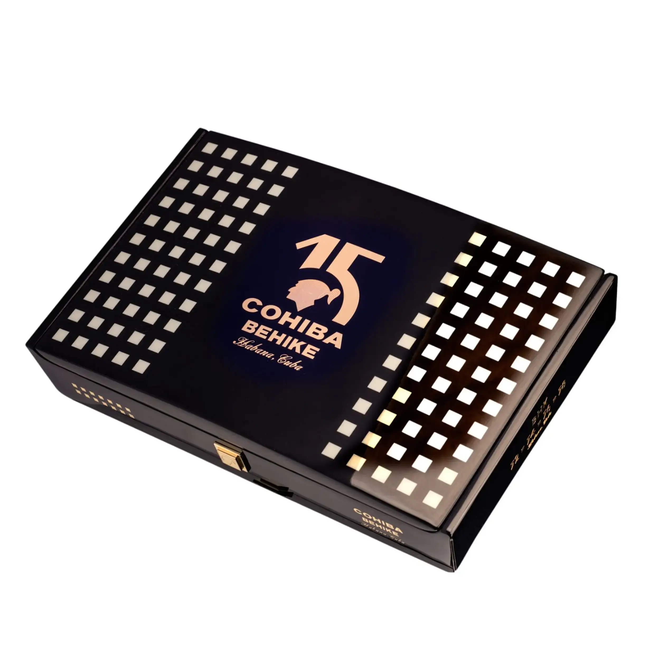 Die hochwertige Kiste überzeugt durch zahlreiche Details: Auf der Vorderseite befindet sich ein massiver Druckknopf mit eingeprägtem Cohiba-Kopf, der das Öffnen der Kiste besonders elegant gestaltet. Zusätzlich ist im Deckel ein NFC-Chip integriert, der zur Authentifizierung der Zigarren genutzt werden kann.